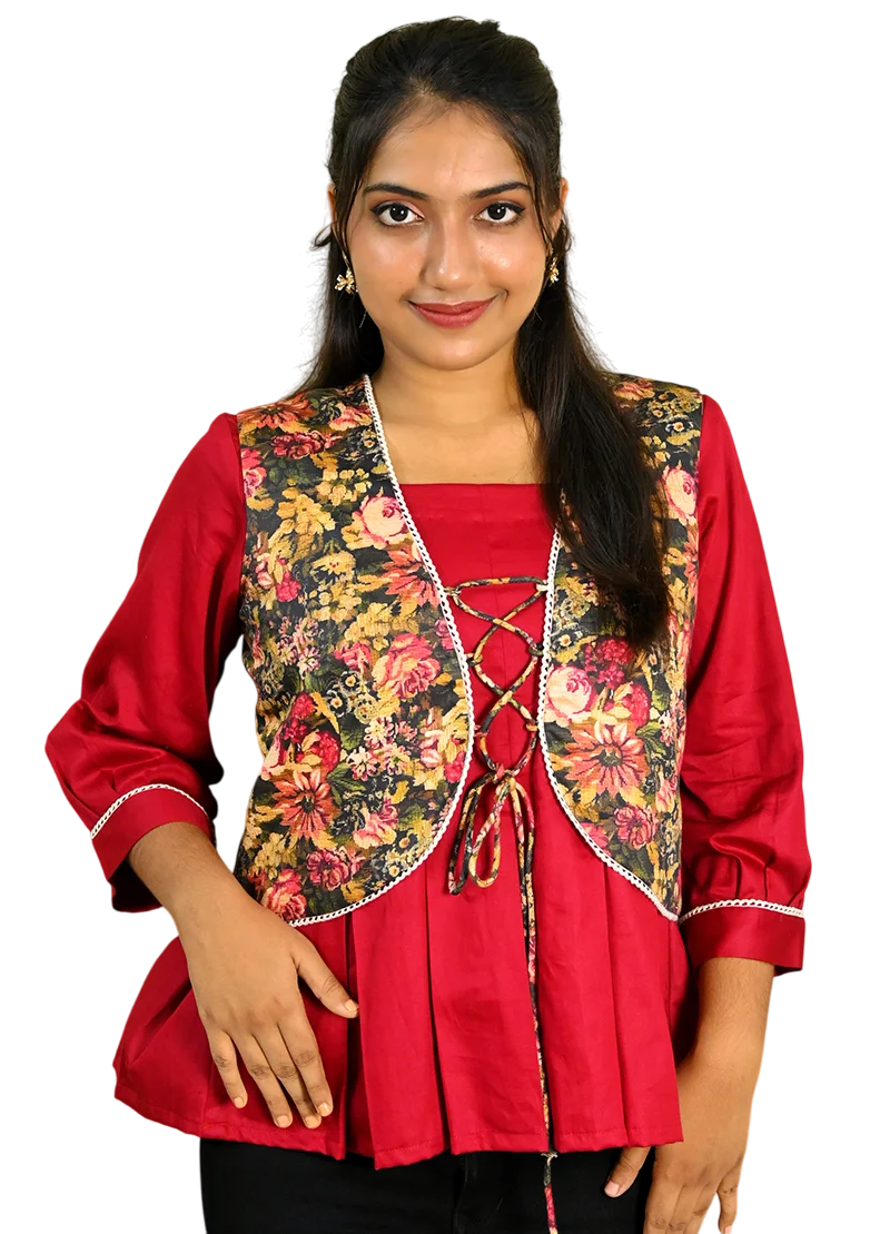 A regal twist on modern-day glam, the Baroque Bloom Top is a fusion of elegance and edge. This deep red structured top features a brocade floral jacket that hugs the waist like a romantic whisper from the past. Detailed with contrast white lace and a functional lace-up tie at the front, it brings vintage-inspired artistry into a contemporary silhouette. The fitted shape enhance the waist and flatter the neckline, making this a perfect statement piece for both day-to-night styling. Pair it with wide-legged trousers or a tiered skirt for that unapologetically bold look.