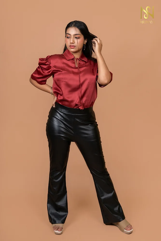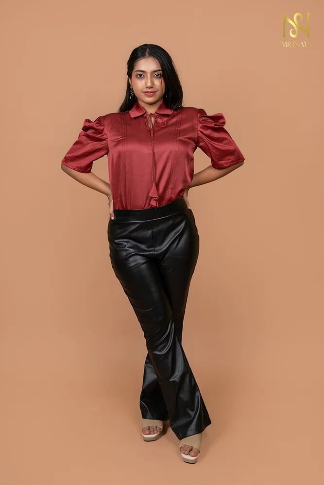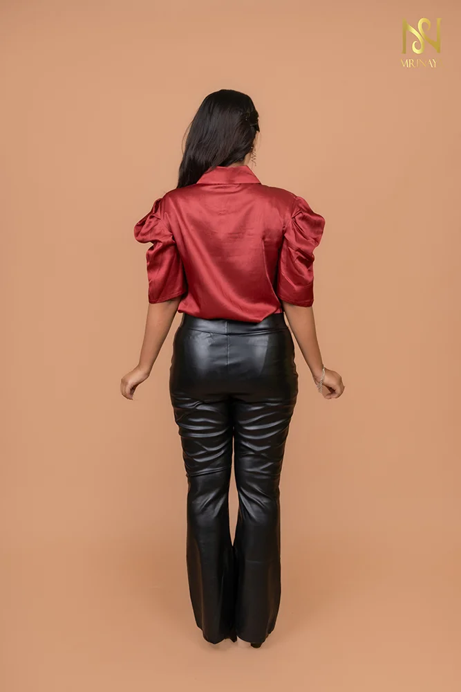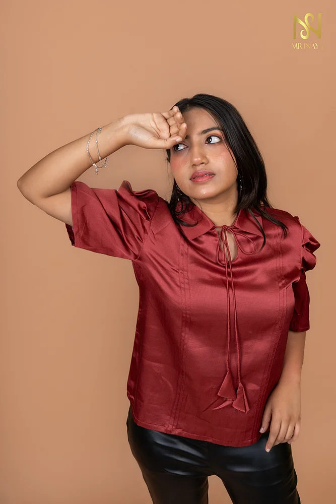 A blend of elegance and boldness. With its rich cherry red hue, statement sleeves, pintuck detail, and delicate dori, it’s the perfect mix of power and femininity. Pair it with sleek bottoms for a look that’s effortlessly chic!