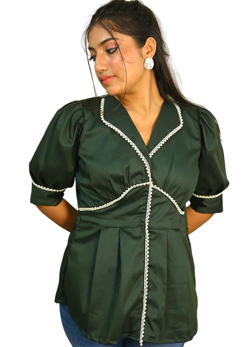 Where timeless tailoring meets playful femininity — the Evergreen Pearl Trim Top is your wardrobe’s newest gem. Crafted from rich forest green cotton, this top features puffed half-sleeves, precise pleats for a flattering shape, and delicate pearl lace that outlines the silhouette with graceful curves.