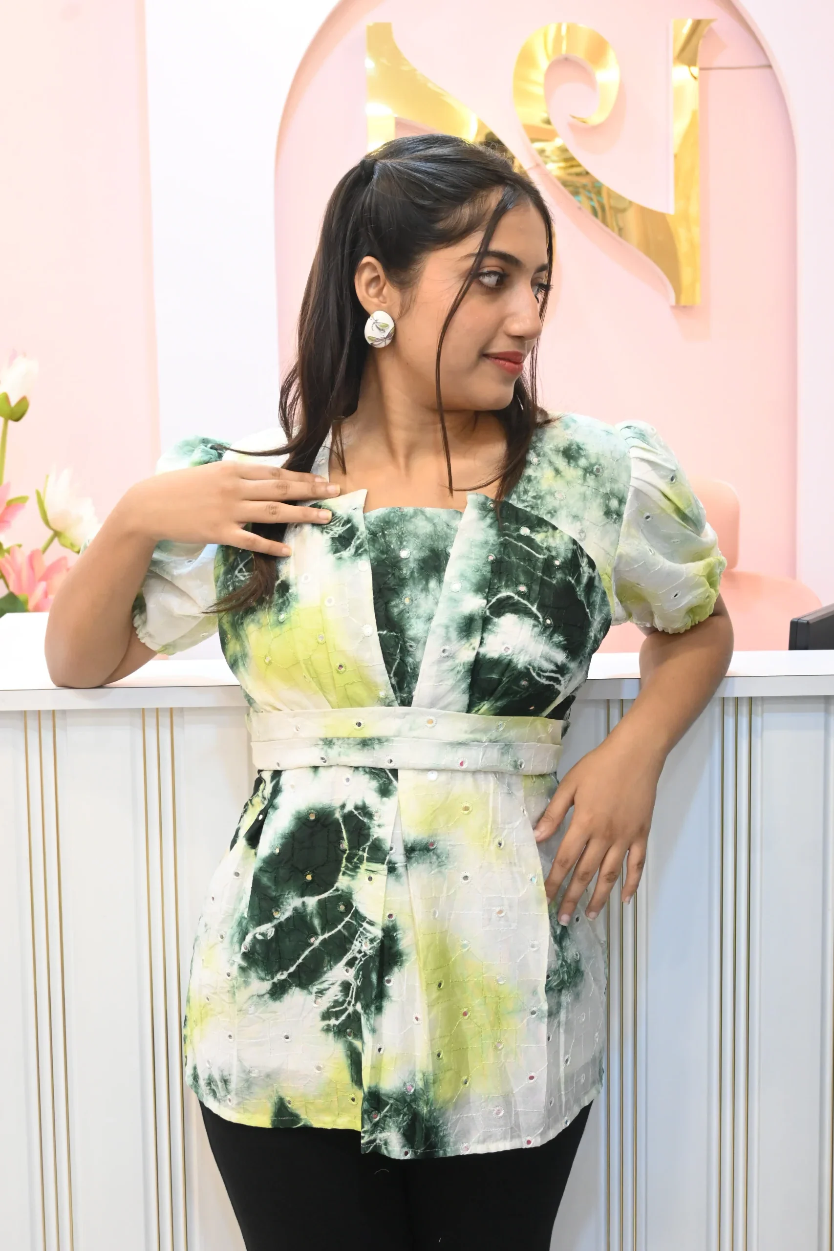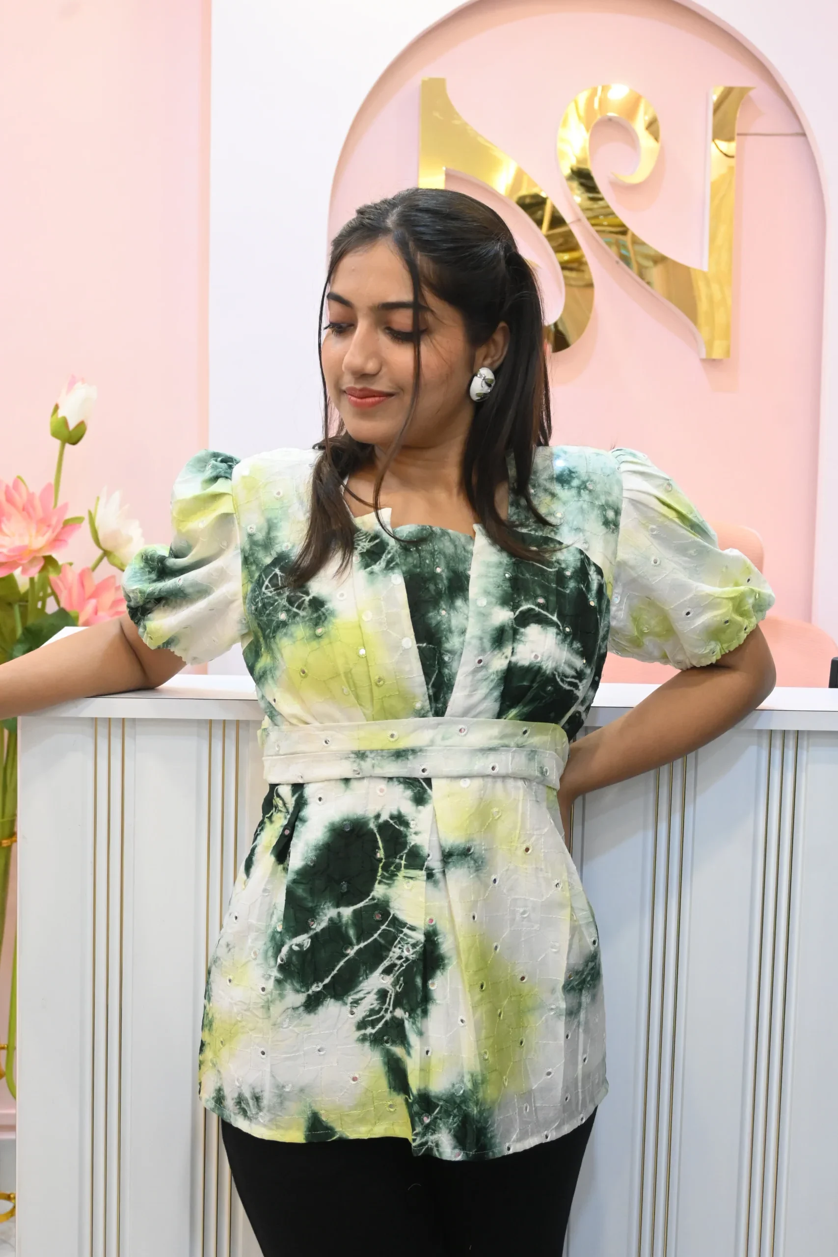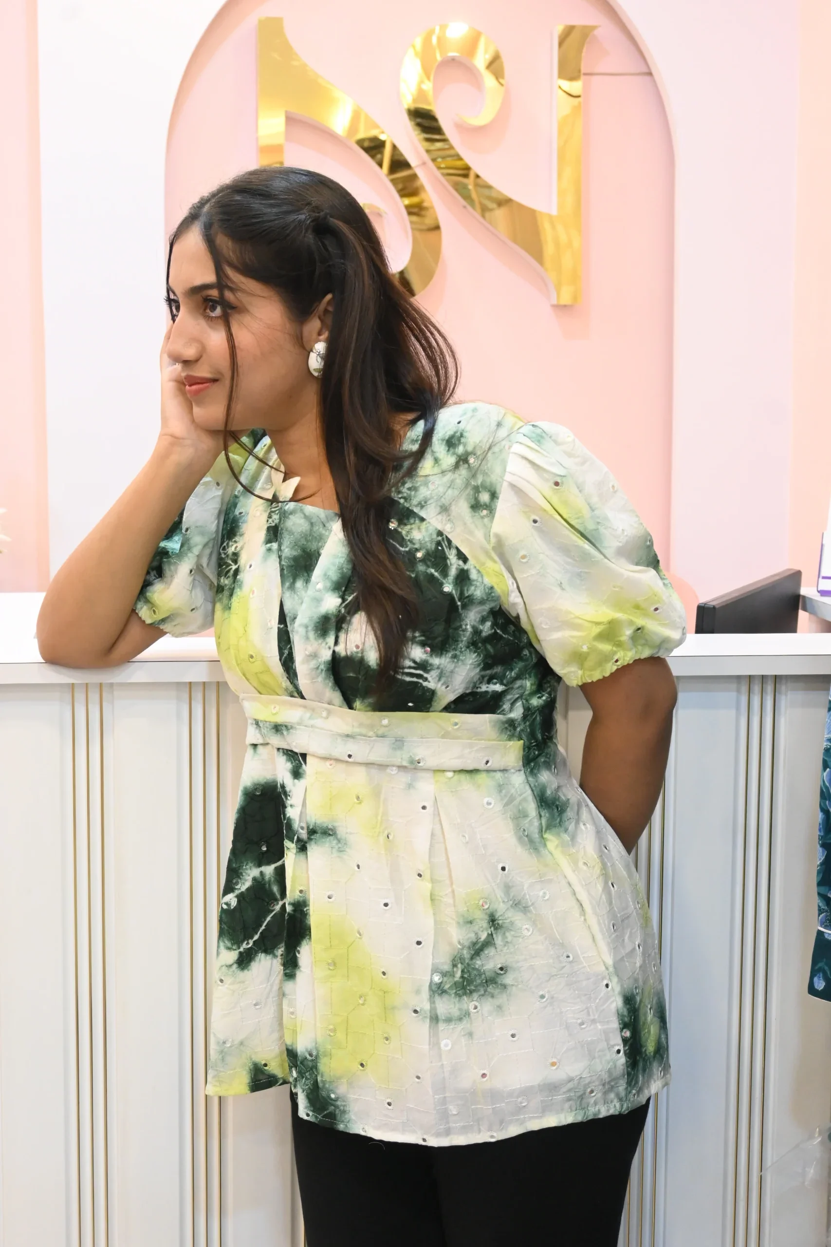 Elevate your style with our Forest Mist Top. This unique top features a beautiful green and white tie-dye pattern over a crisp hakoba eyelet fabric, creating a striking watercolor effect. The plunging V-neckline adds a touch of modern chic, while the wide, cinched waist creates a flattering, structured silhouette. Dramatic puffed sleeves and a slight peplum hem complete this show-stopping look. It’s the perfect blend of artistic charm and effortless elegance.