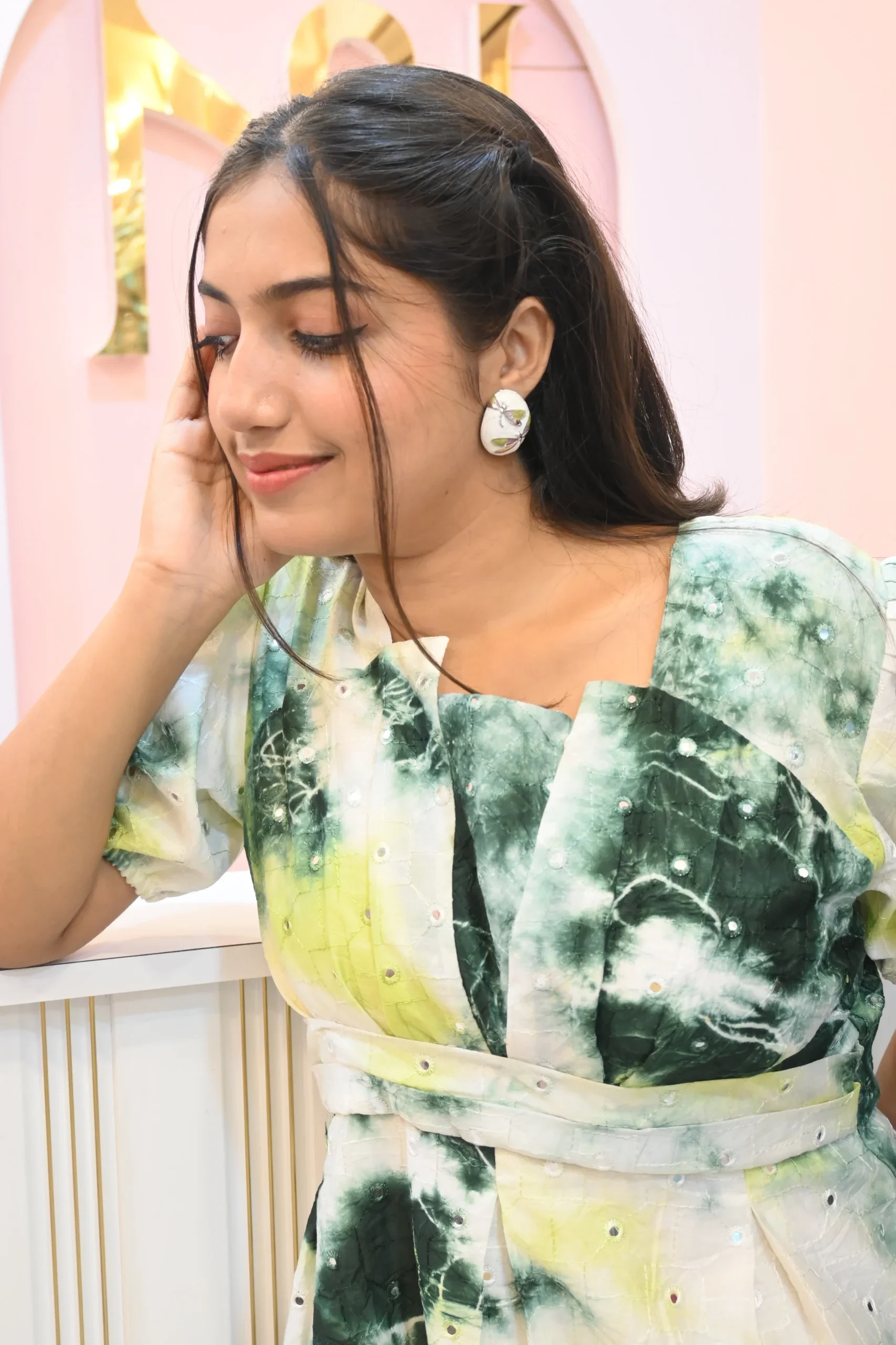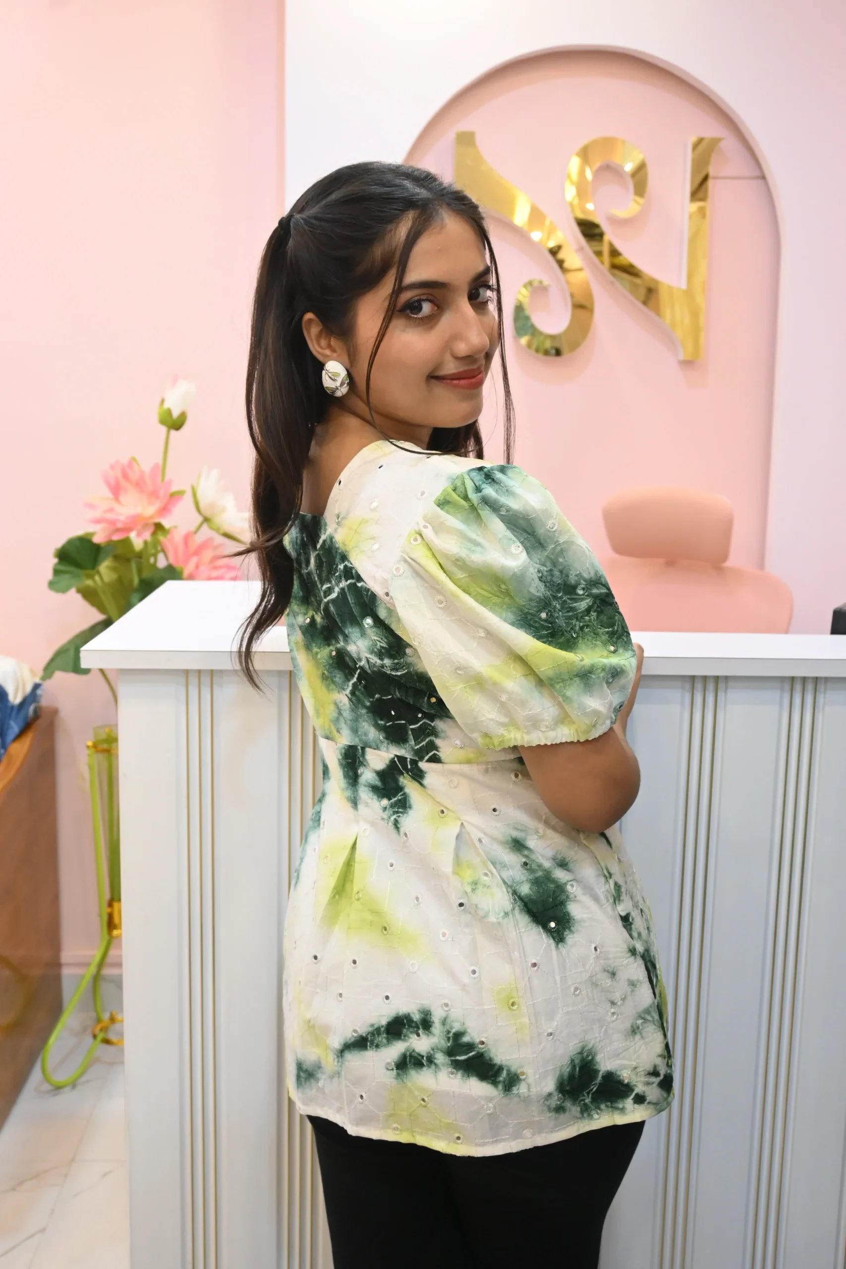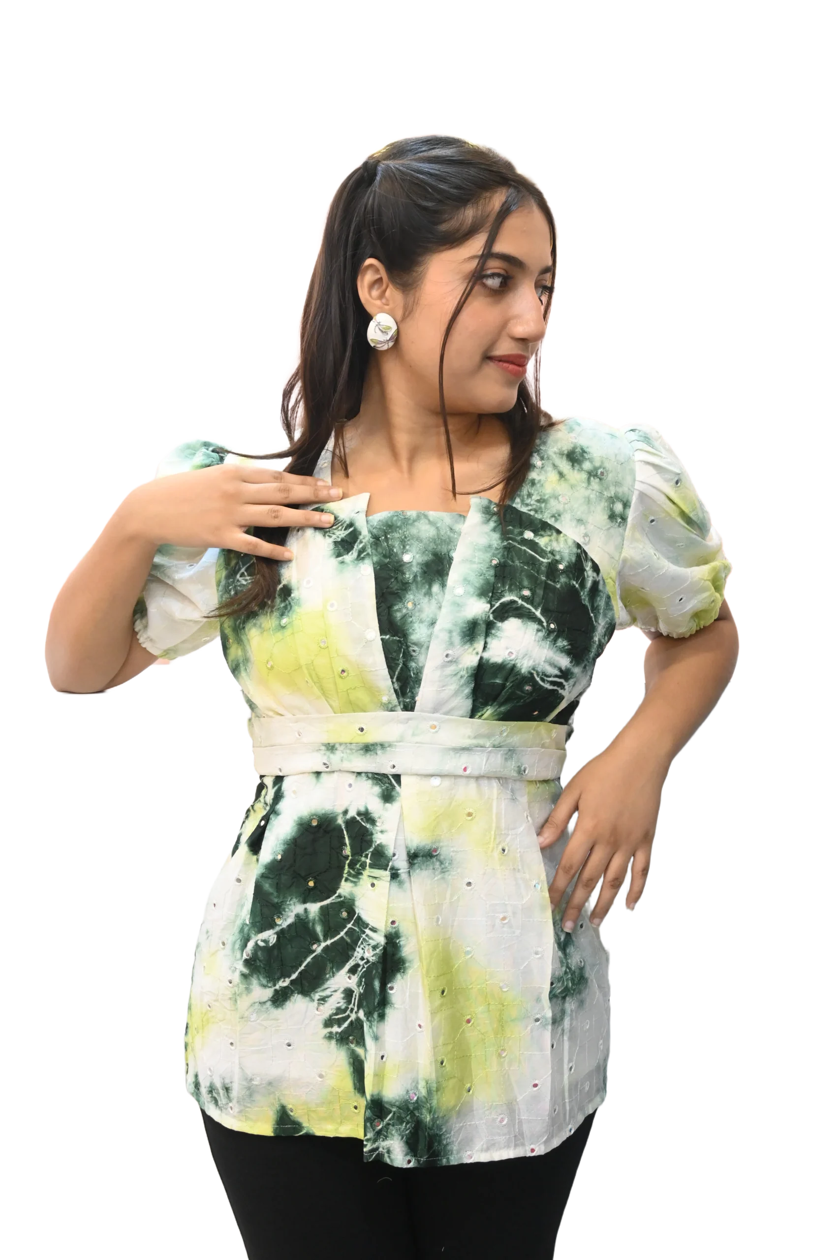 Elevate your style with our Forest Mist Top. This unique top features a beautiful green and white tie-dye pattern over a crisp hakoba eyelet fabric, creating a striking watercolor effect. The plunging V-neckline adds a touch of modern chic, while the wide, cinched waist creates a flattering, structured silhouette. Dramatic puffed sleeves and a slight peplum hem complete this show-stopping look. It’s the perfect blend of artistic charm and effortless elegance.