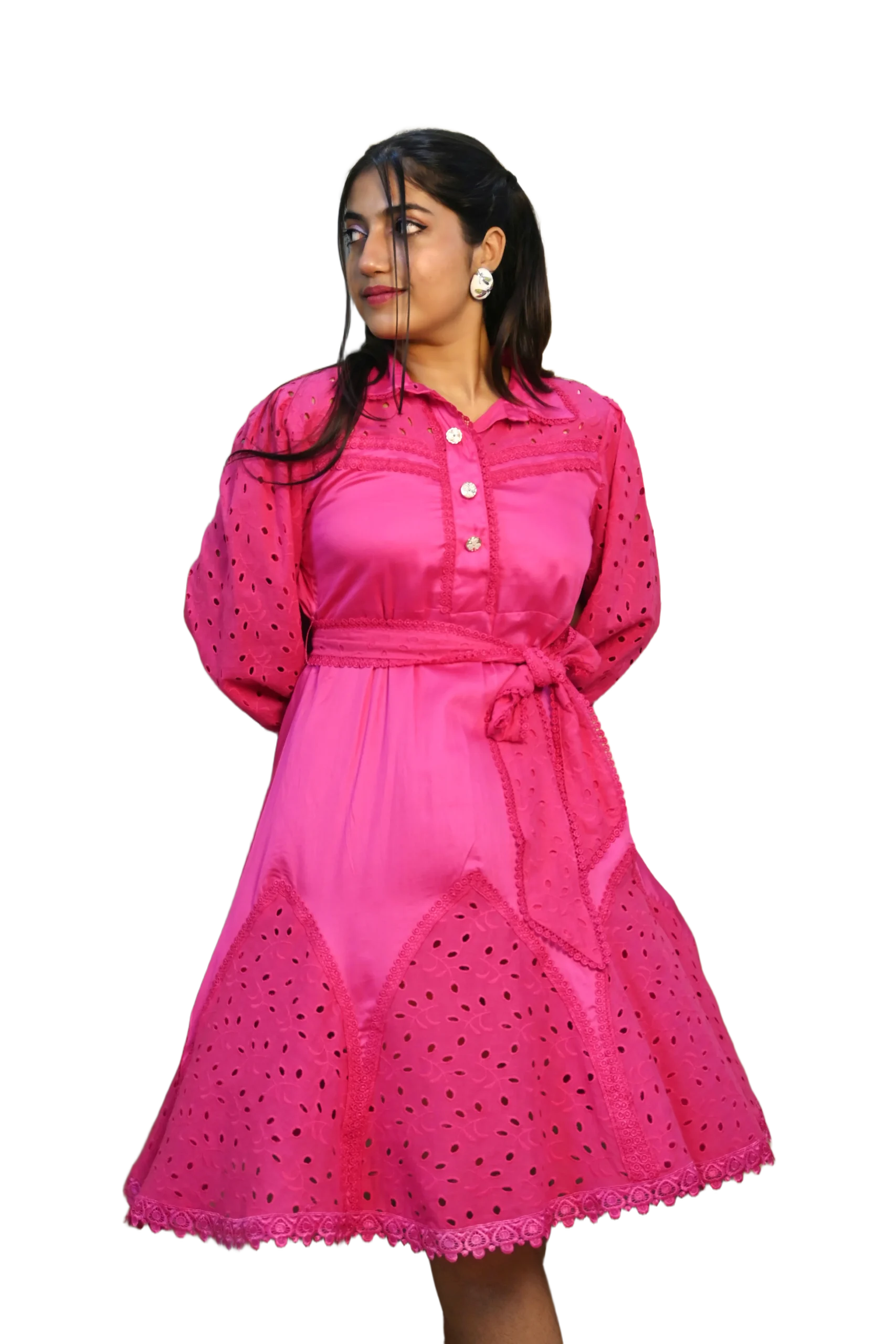 Make a bold statement in our Fuchsia Fantasy Dress. This dress is a vibrant vision, combining a rich fuchsia color with beautiful hakoba eyelet embroidery. It features a tailored button-down top with a sharp collar and sophisticated pearl-like buttons. The standout element is the unique, scalloped hakoba hemline and sleeve details, which add a touch of romance and whimsy. A matching tie-waist belt cinches the silhouette, creating a look that’s both polished and fun. Perfect for parties, brunches, or any event where you want to radiate confidence and style.