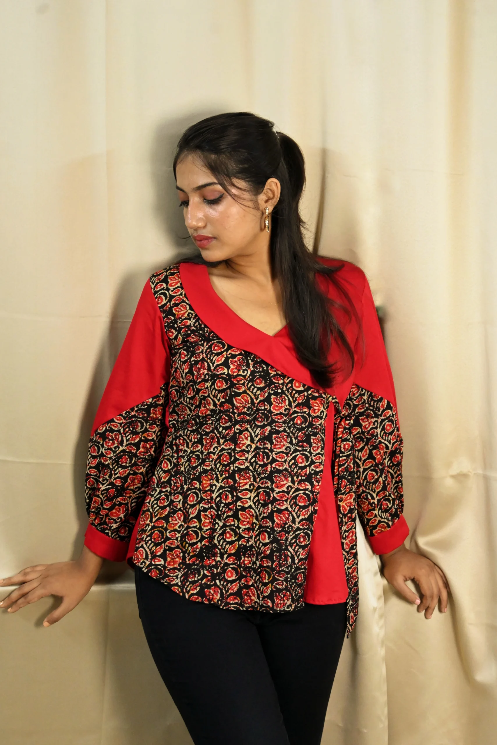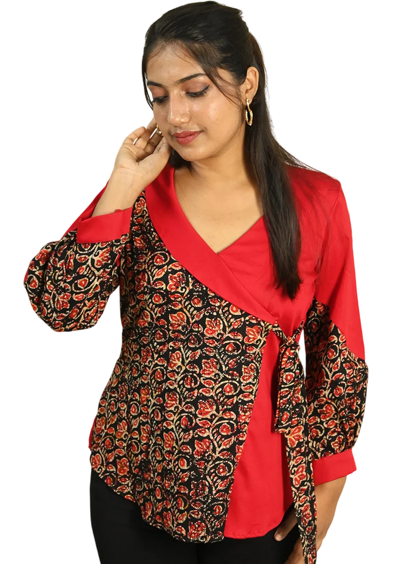Elevate your everyday wardrobe with this striking Kalamkari Wrap-Style Top. The rich red cotton base is beautifully contrasted with digitally printed Kalamkari panels, featuring a floral motif that adds warmth and vibrancy. The asymmetric wrap silhouette flatters the waist, and the gathered sleeves add a touch of drama. A side tie detail finishes the look with both elegance and ease.