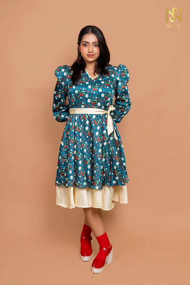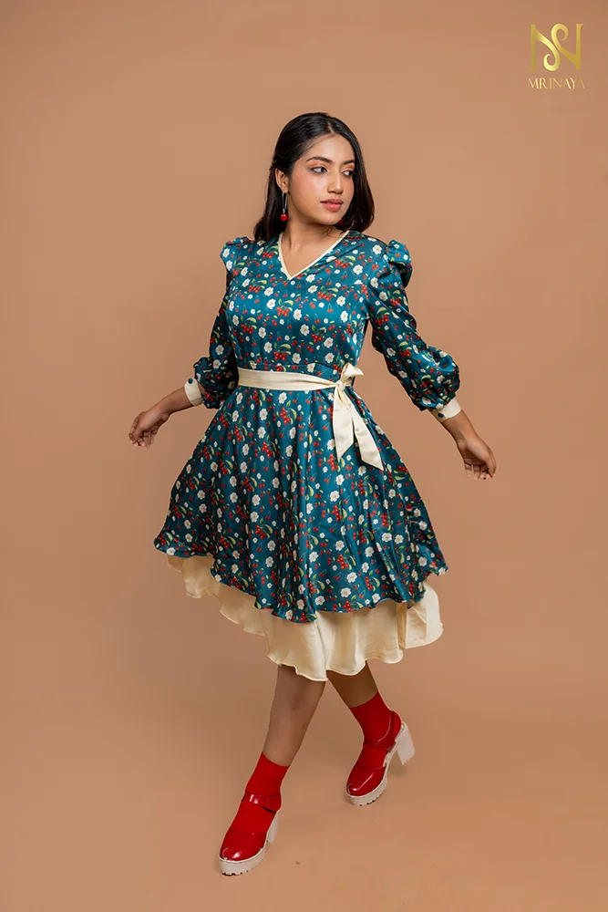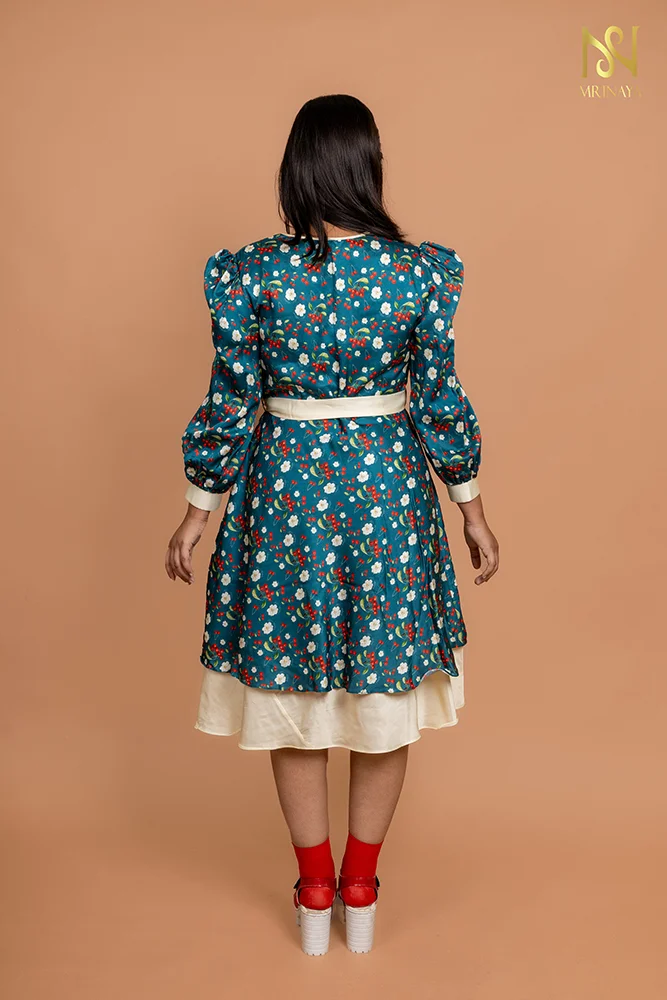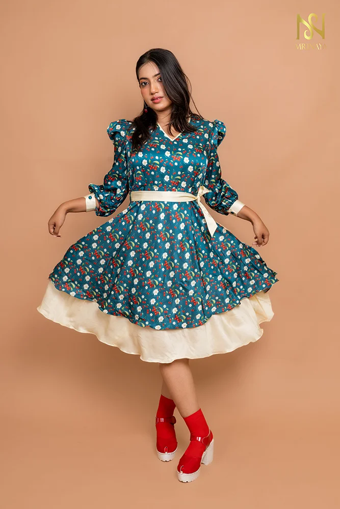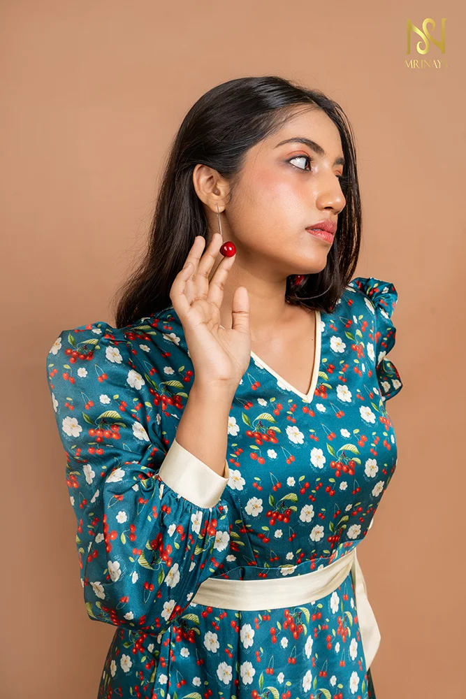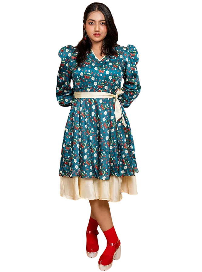 Indulge in the charm of vintage romance with our Lady of Cherries Dress! This dreamy silhouette features a playful cherry print on a rich teal base, adorned with delicate white florals for a whimsical touch. The puffed sleeves, fitted waist, and voluminous layered hem bring a graceful, twirl-worthy feel, while the ivory satin belt cinches the waist to perfection.