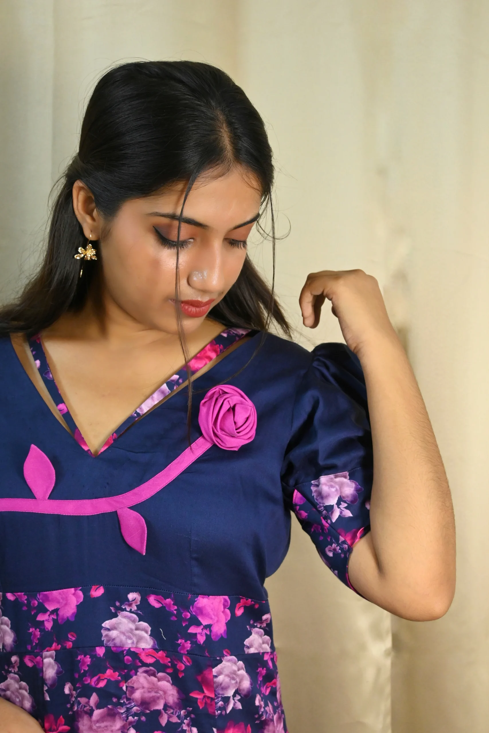 Bring the charm of dusk blossoms to life with the Midnight Garden Dress. Crafted in a bold navy hue and adorned with hand-illustrated magenta florals, this dress is all about statement femininity. The puffed sleeves add a touch of vintage drama, while the flattering V-neck wrap bodice creates a graceful silhouette. Accented with delicate contrast piping and a handcrafted rose detail at the waist, the dress flows effortlessly into a flared hem—perfect for twirls and timeless photographs. Whether you’re headed to a garden brunch or a cozy dinner party, this dress will have all eyes on you.