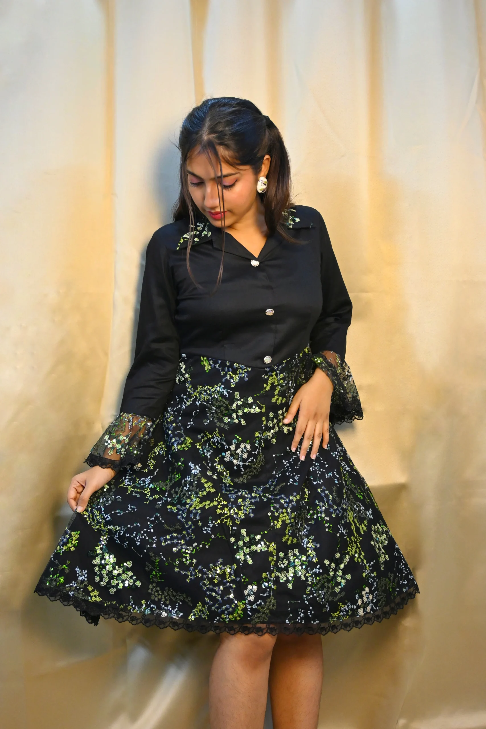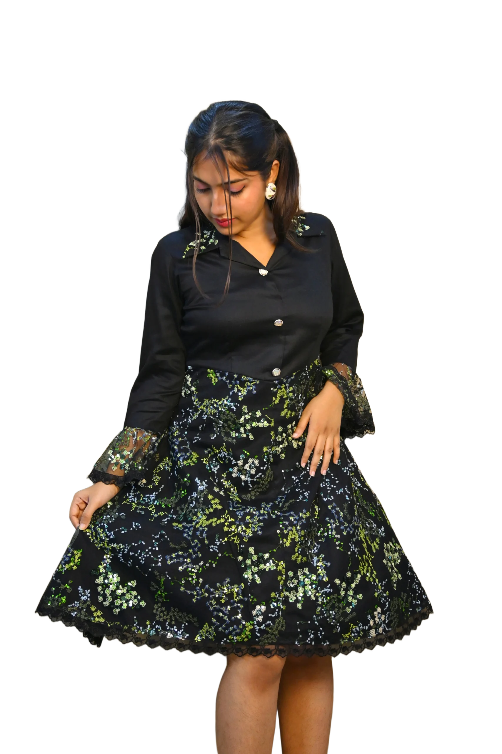 Unleash your inner radiance with the Midnight Petal Sequin Dress. This enchanting black dress features a refined button-front top with a crisp collar and long sleeves finished with elegant lace-trimmed flare cuffs. The standout feature is the full, voluminous skirt, which comes alive with a captivating green and white floral design sparkling with delicate sequins. This dress combines timeless elegance with a modern, glamorous edge, ensuring you’re the star of any event.