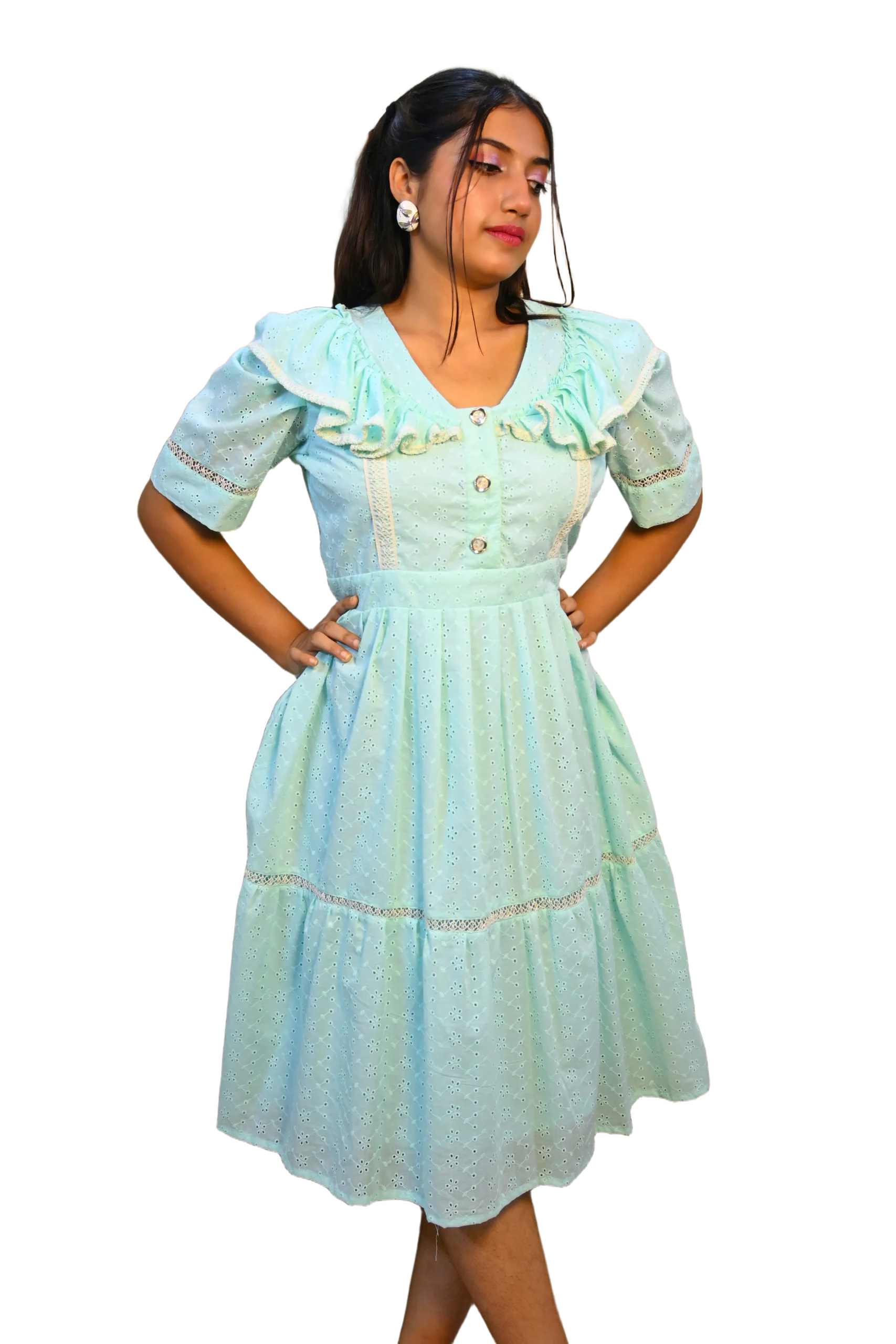 Harmonize your wardrobe with the beautiful Mint Melody Tiered Dress. This lovely ice blue dress is made from delicate hakoba fabric, featuring an array of charming details. It showcases a whimsical ruffled V-neckline, a button-front with elegant accents, and delicate white lace inserts that add a touch of vintage appeal. The tiered skirt flows gracefully, making this dress a sweet and sophisticated option for any casual or semi-formal event.