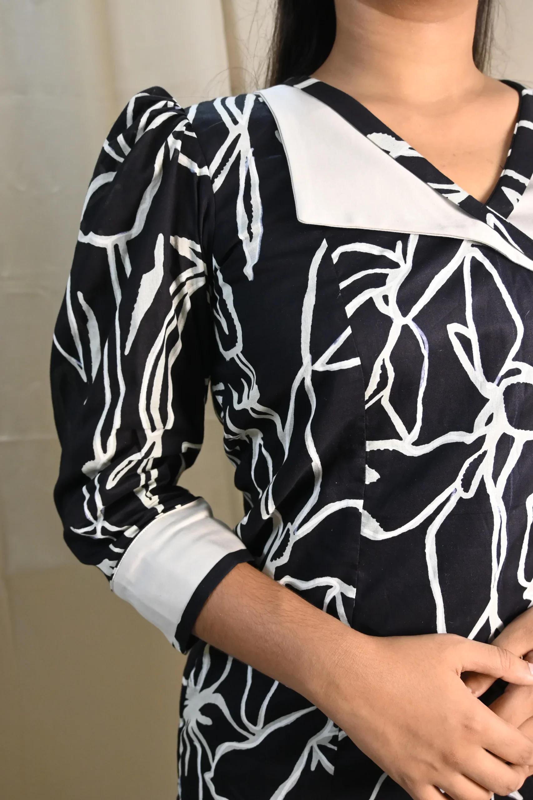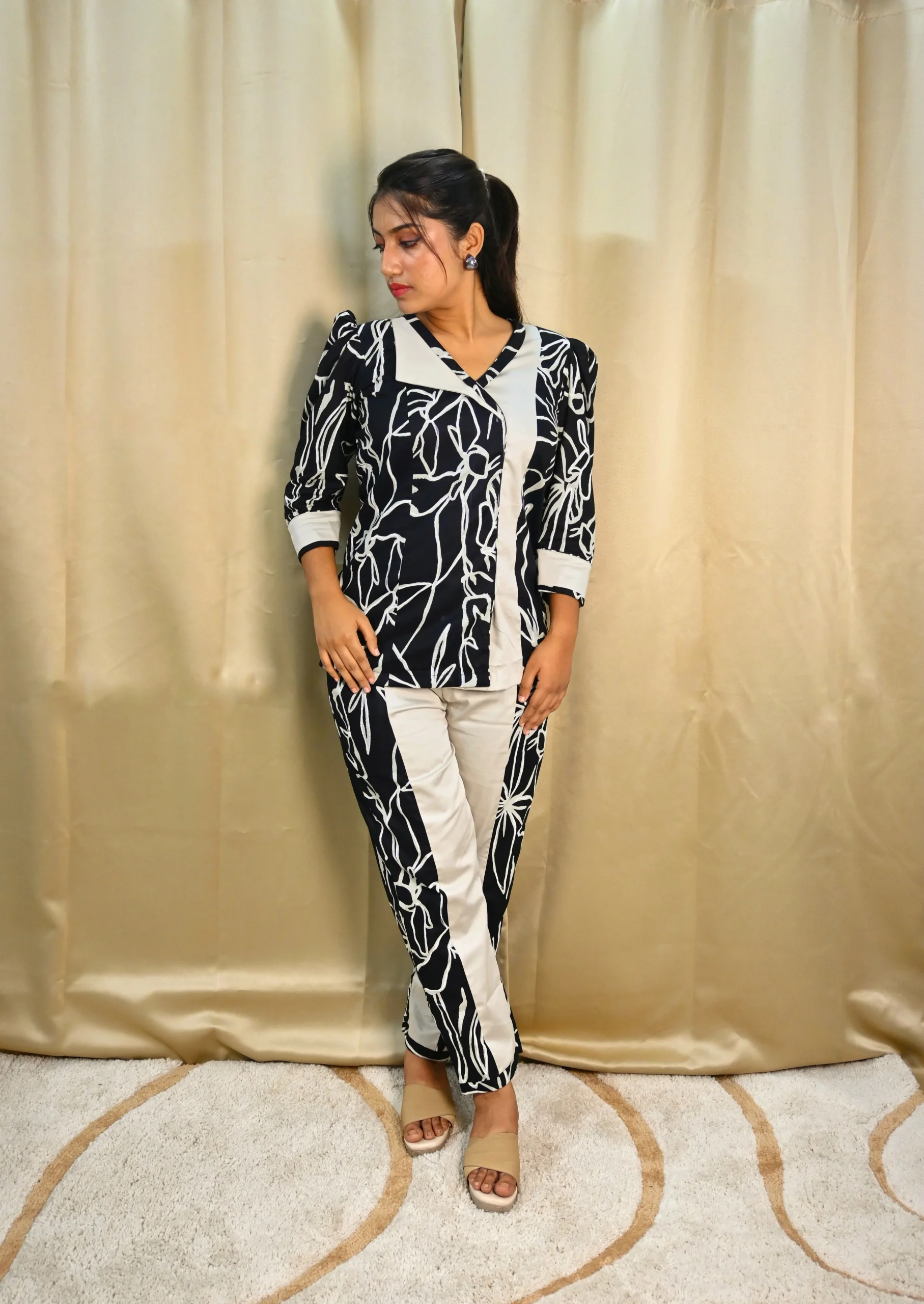 Artful simplicity meets power dressing in the Monochrome Sketch Co-ord Set. Inspired by line art and brushstroke florals, this black-and-white duo is perfect for the minimalist who still craves personality. The collared top features statement floral illustrations with a clean button-down front, while the high-waisted pants maintain structure and ease with a flattering fit. Made from soft yet sturdy cotton, this co-ord transitions effortlessly from studio hours to gallery nights. It’s an expression of quiet confidence—with a creative edge.