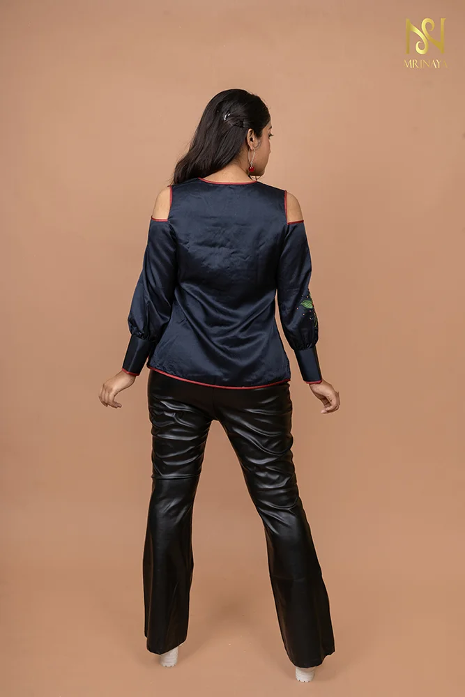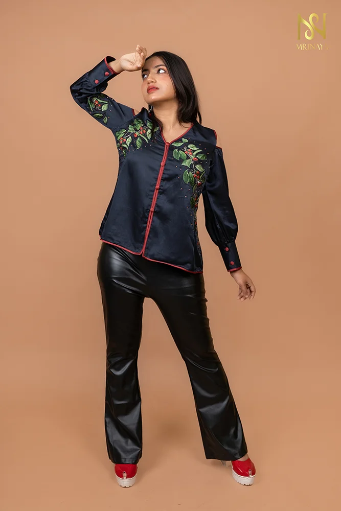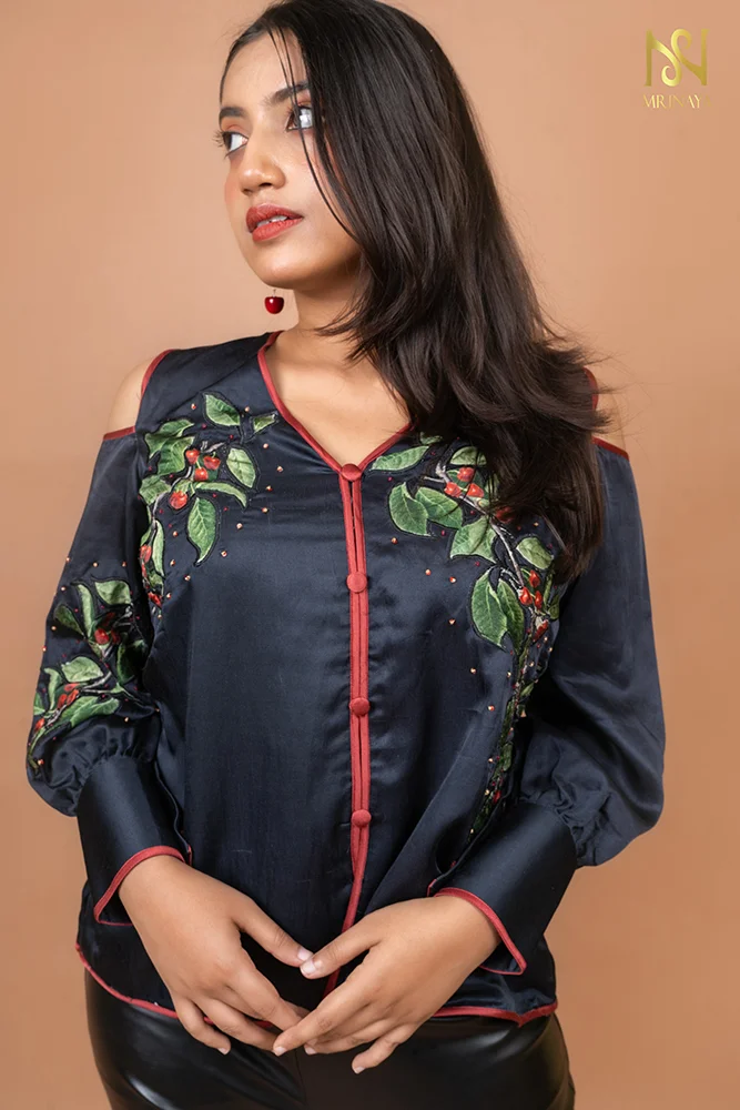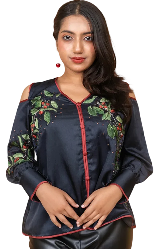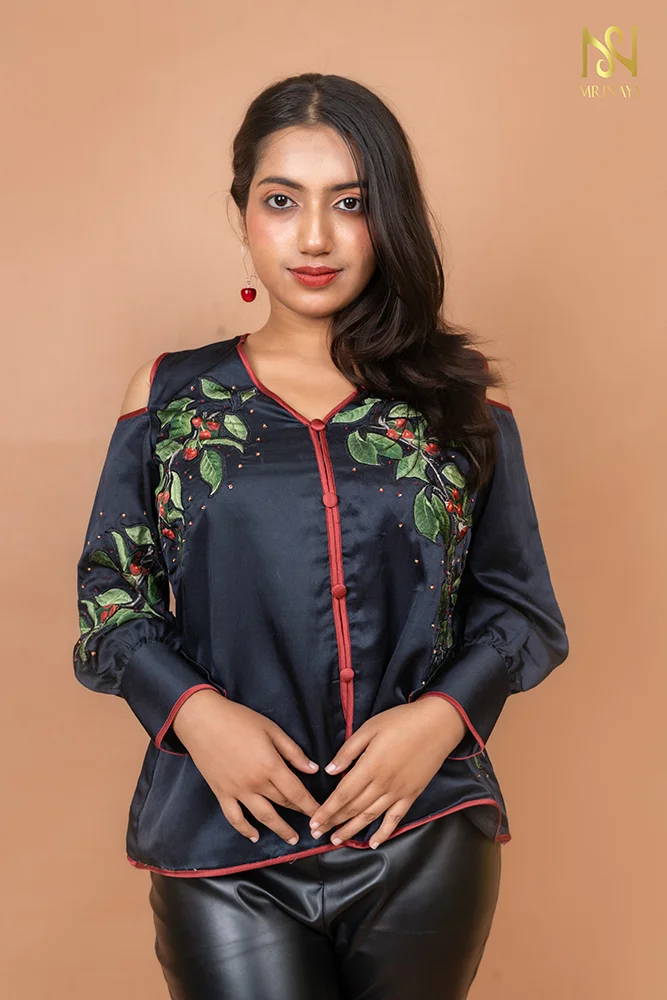 A perfect mix of elegance and charm! This cold-shoulder top features delicate cherry print appliqué, shimmering sequins, and cherry-like buttons for a playful yet sophisticated touch. Finished with contrast piping, it’s a statement piece that stands out effortlessly! Available in two statement colours – Ivory and Black.
