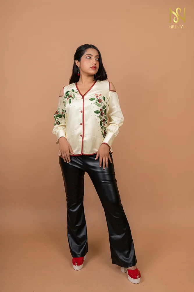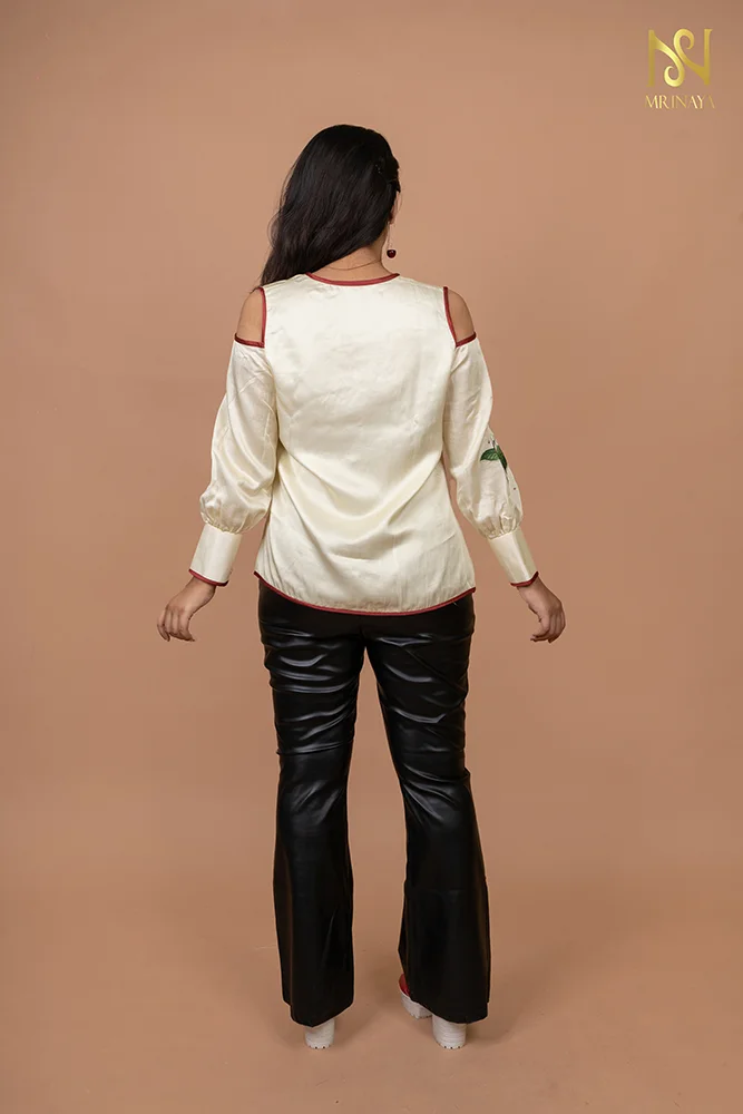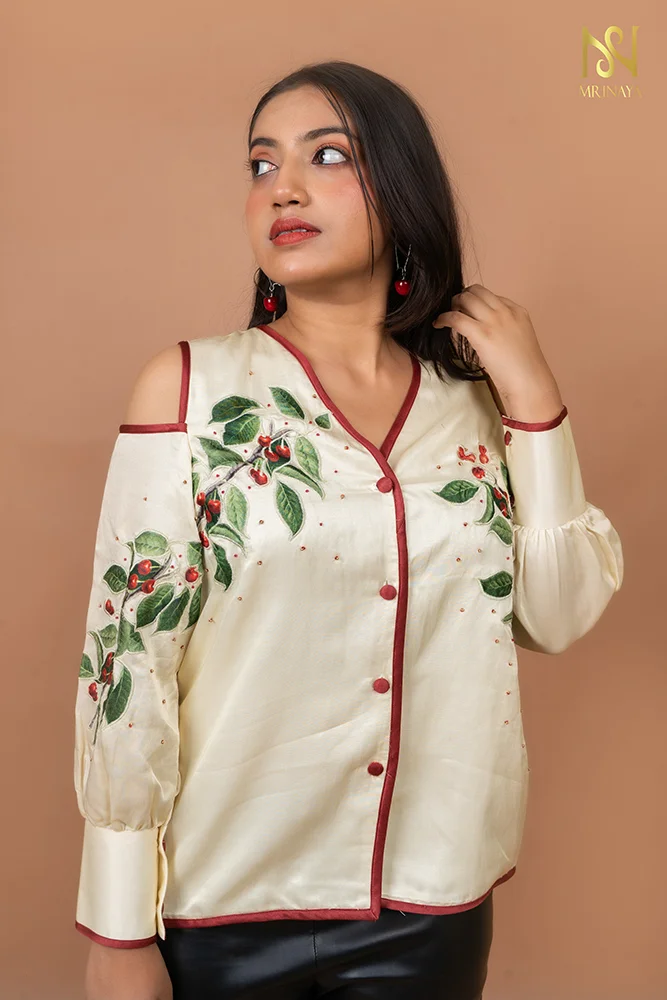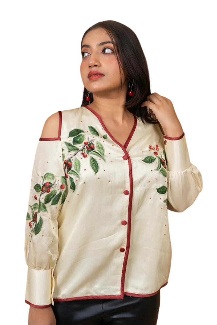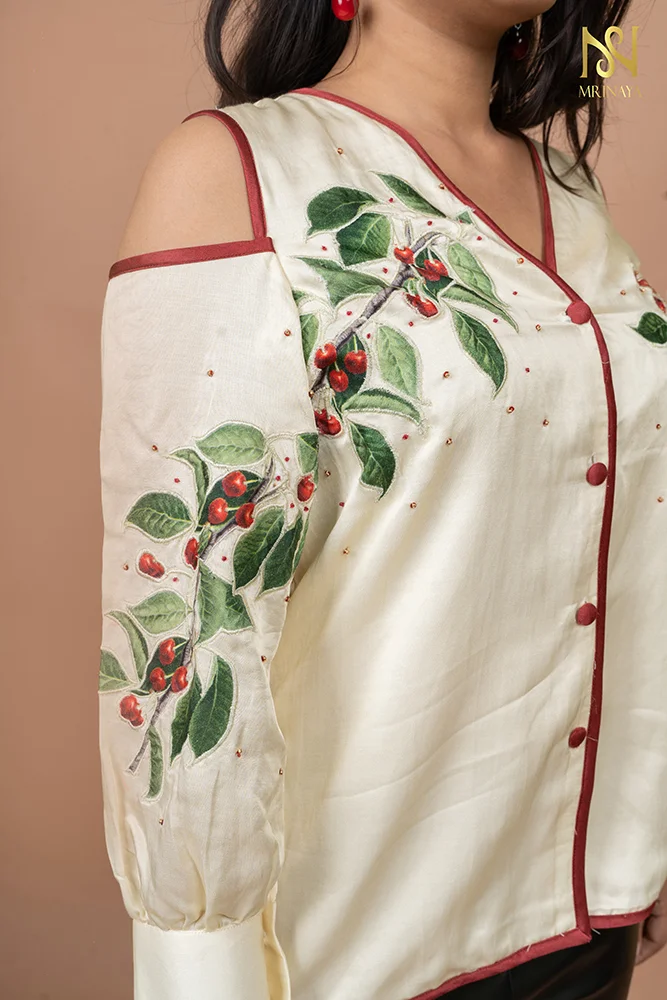 A perfect mix of elegance and charm! This cold-shoulder top features delicate cherry print appliqué, shimmering sequins, and cherry-like buttons for a playful yet sophisticated touch. Finished with contrast piping, it’s a statement piece that stands out effortlessly! Available in two statement colours: Ivory and Black.