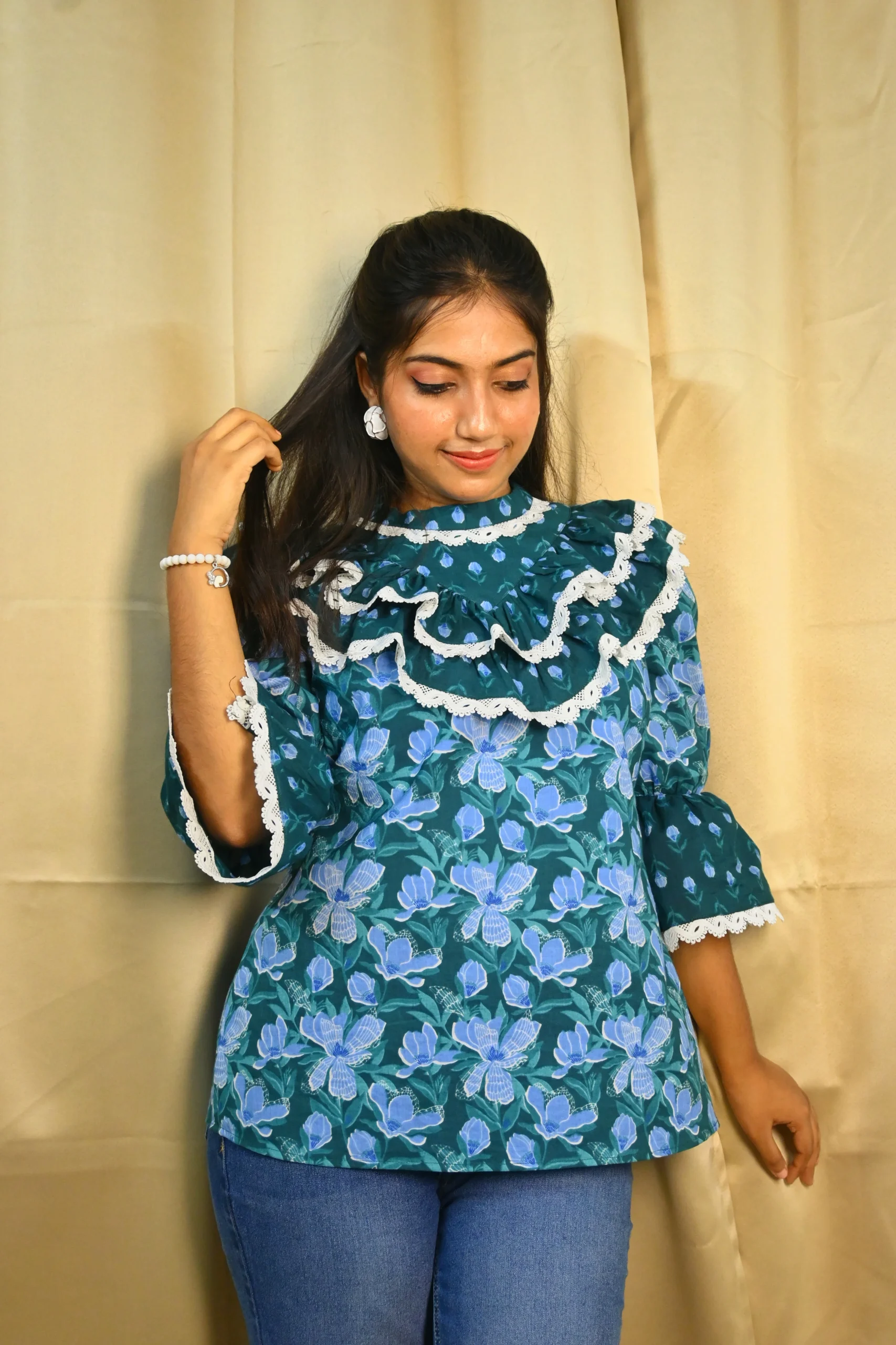 Bold. Beautiful. Blooming with whimsy. The Petal Ruffle Blouse is your go-to pick for standout femininity with a playful twist. Crafted in a teal floral digital print and elevated by a double-tiered ruffle neckline trimmed with delicate lace, this top is all about joyful statement dressing. The three-quarter sleeves and subtle A-line silhouette make it just as flattering as it is fun.