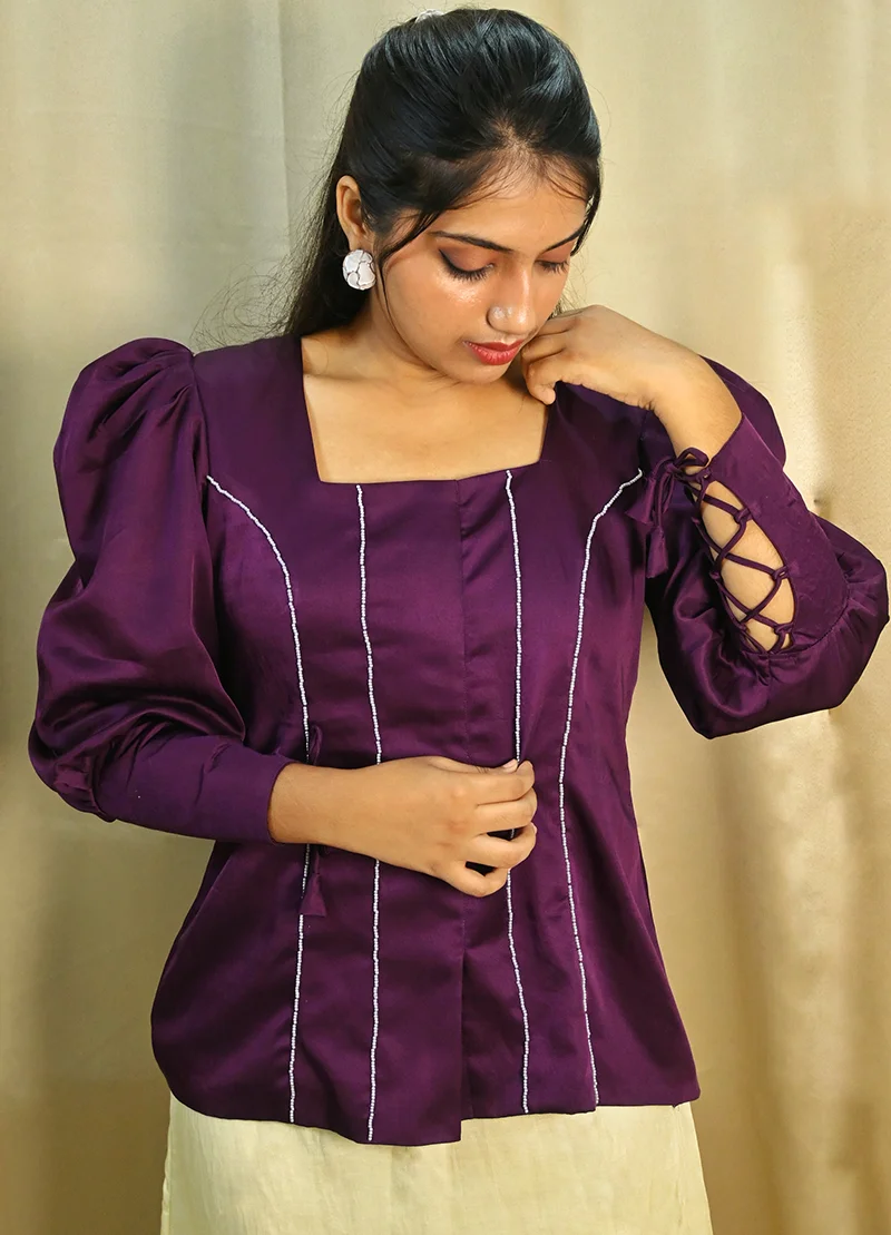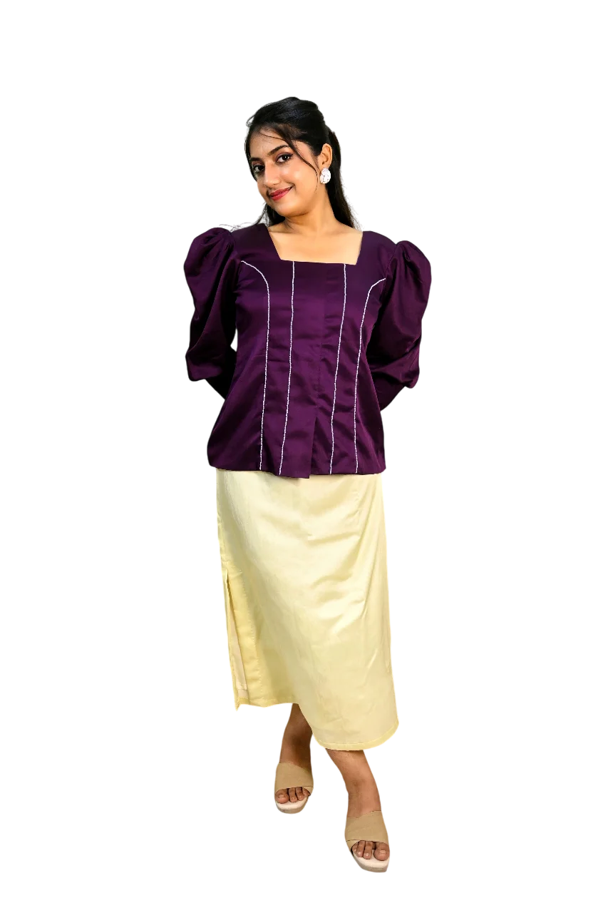 This powerful yet elegant two-piece set features a structured square-neck blouse with dramatic puff sleeves and contouring vertical lines. Paired with a sleek ivory satin pencil skirt and thigh-high slit, the ensemble is adorned with refined pearl detailing that adds a touch of royalty. A perfect blend of strength and softness.