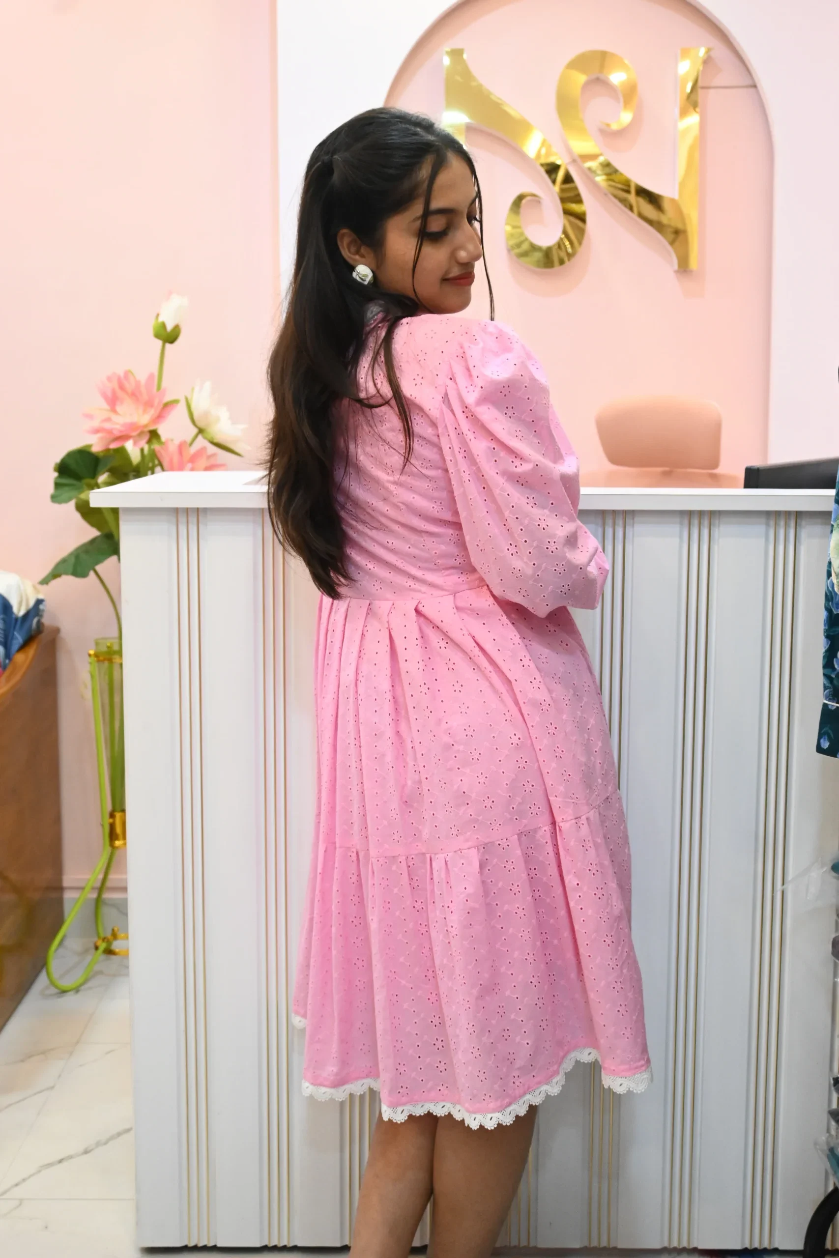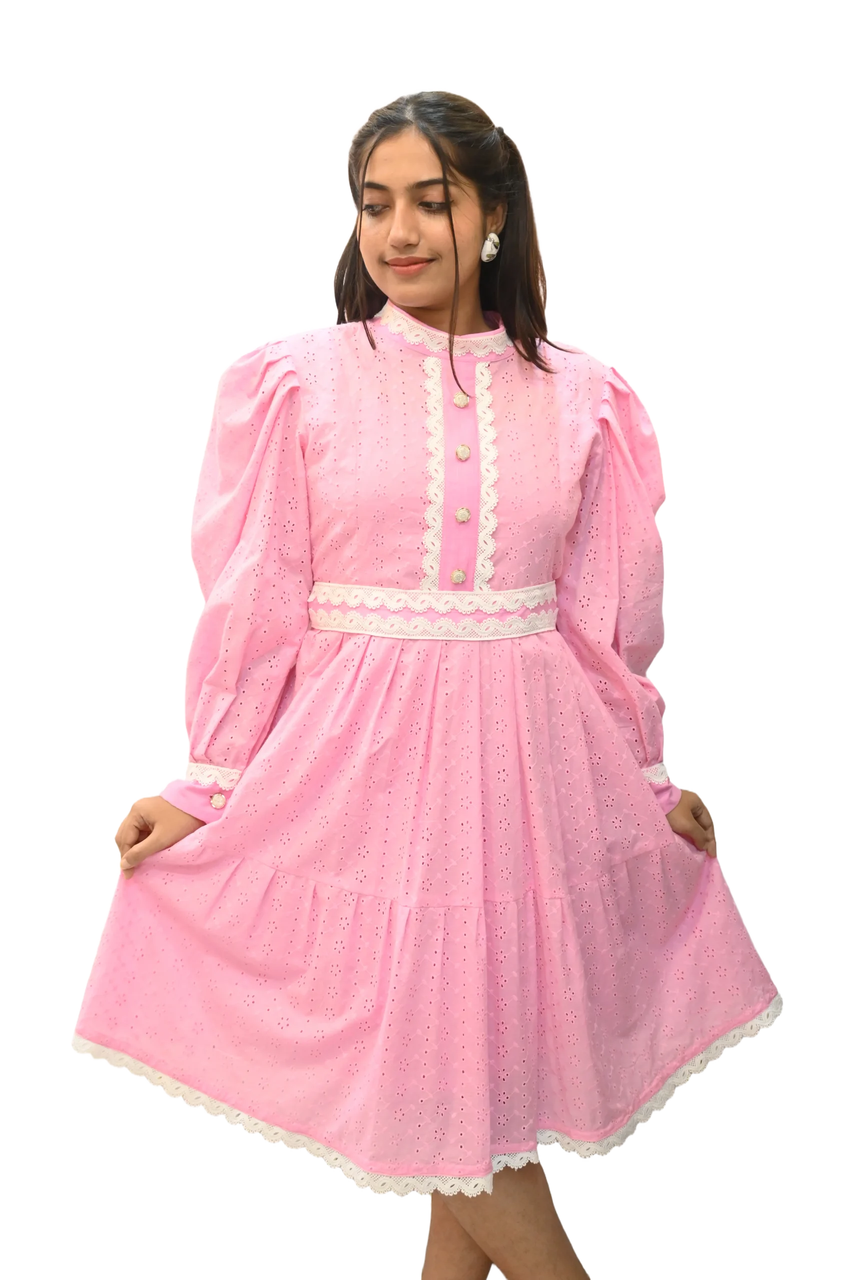 Embrace a timeless look with the Sugarplum Dress. This gorgeous pink dress is a modern take on a classic style. It features a refined high neck, long puffed sleeves, and a series of pearl-like buttons down the front. The beautiful white lace trim on the bodice and cuffs, combined with the all-over hakoba eyelet detail, gives it a unique, delicate texture. The tiered skirt adds volume and movement, making this dress an exquisite choice for a memorable occasion.