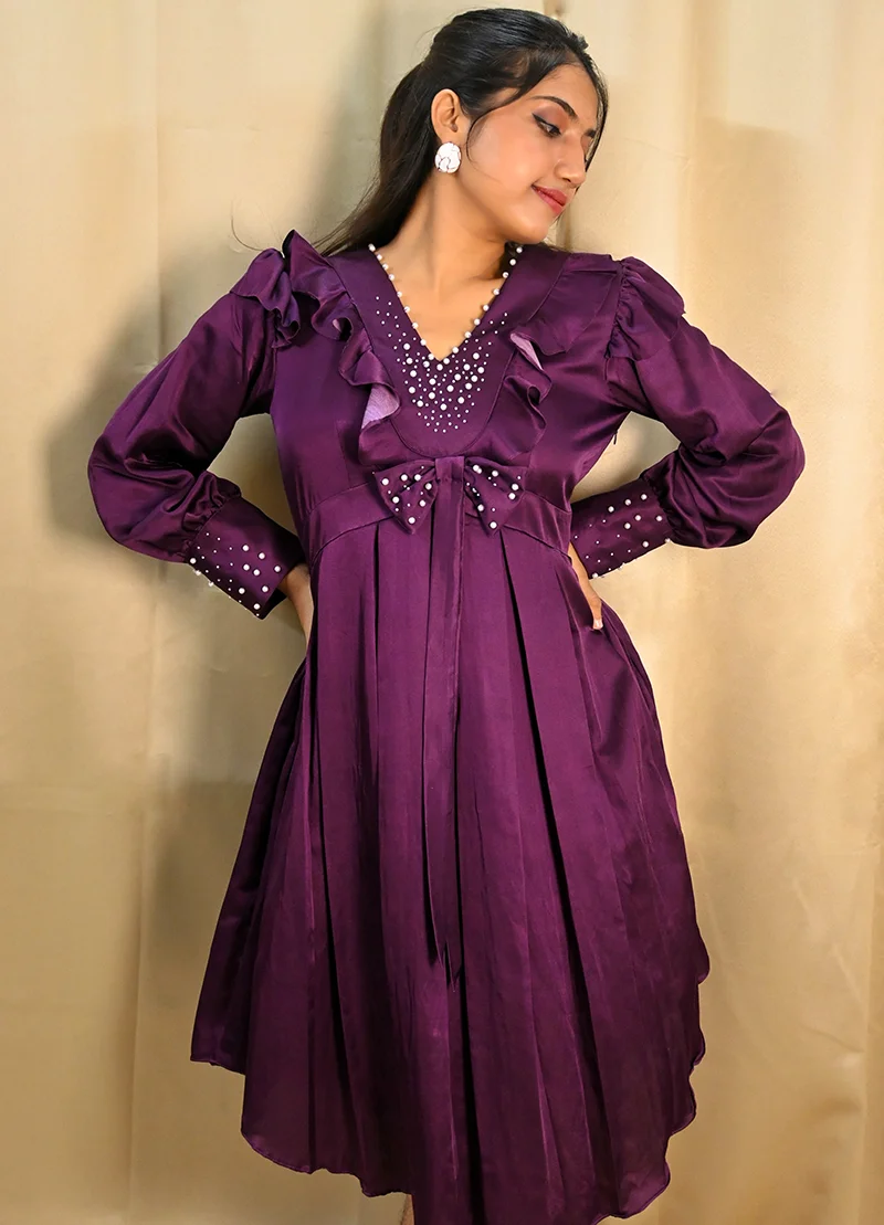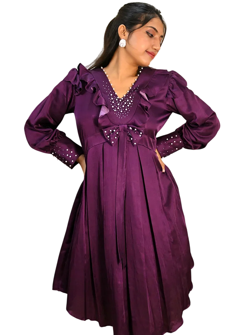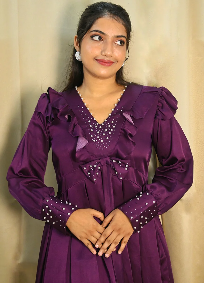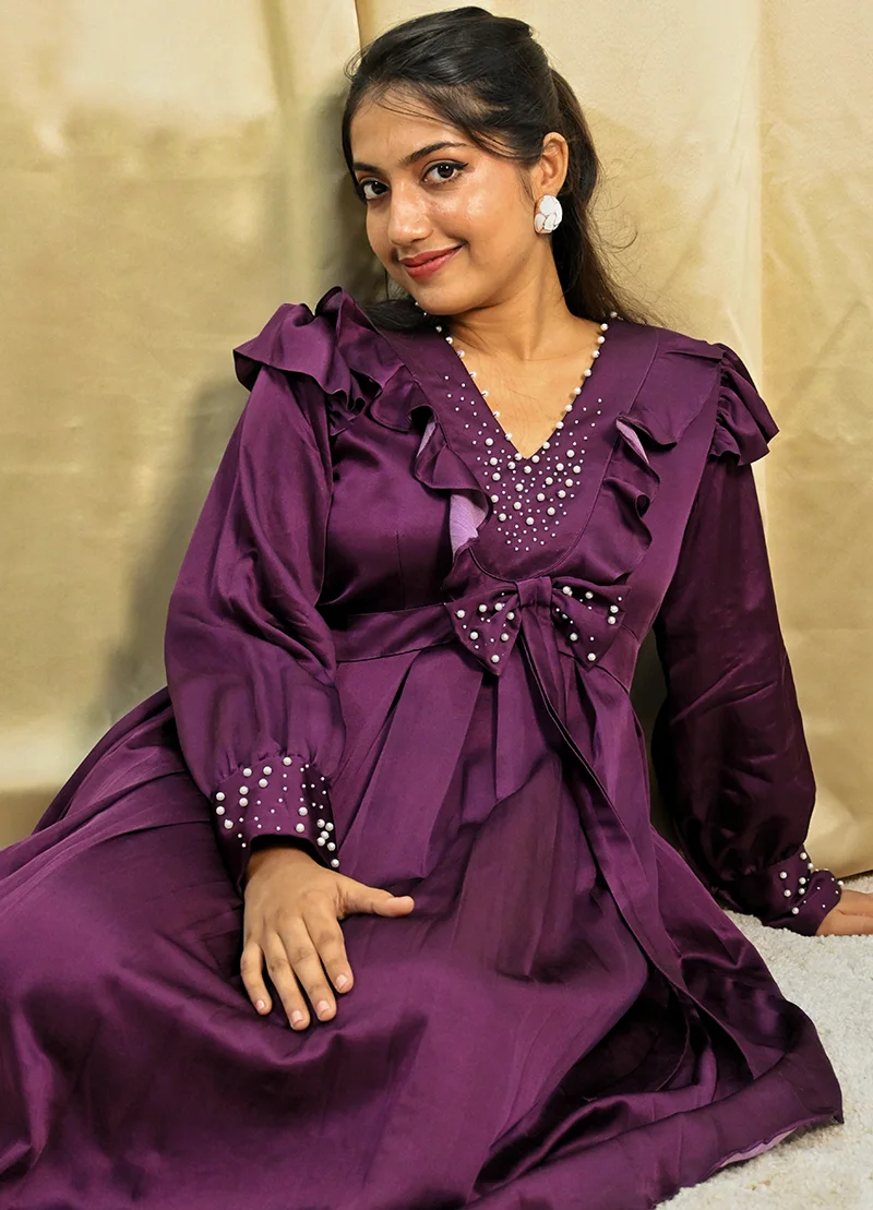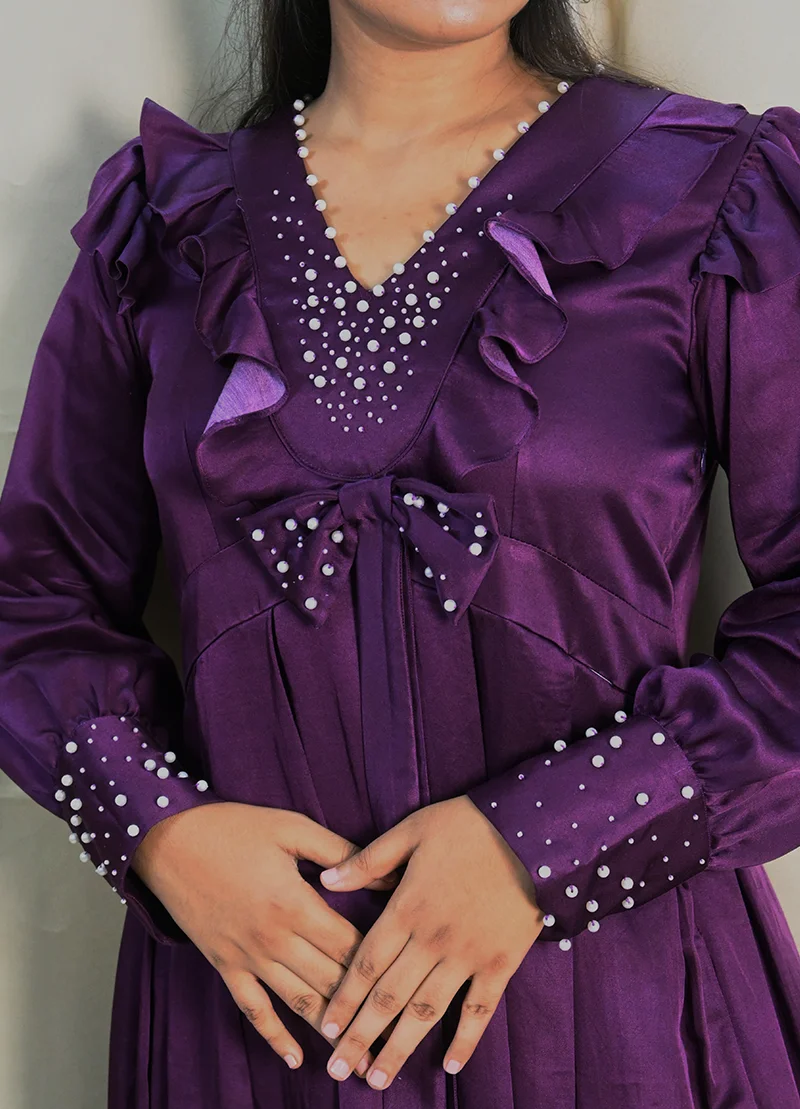A modern take on vintage charm — this flared dress in deep plum satin features dainty ruffles and long sleeves with pearl-embellished cuffs. The bodice is enriched with delicate pearl embroidery, creating a sweet yet sophisticated mood. Whether it’s date night or a special event, this look brings drama with grace.