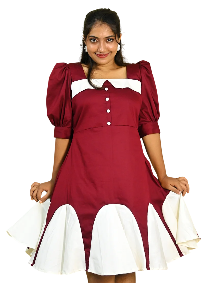 Step into timeless charm with our Vintage Maroon Panel Dress, a delightful fusion of bold structure and feminine flair. Designed with a flattering fit-and-flare silhouette, this dress features a structured square neckline, puffed sleeves, and bold white panels that create a scalloped effect on the hem — perfect for twirling! The front button detailing and crisp contrast yoke add a retro-chic finish that makes this piece a standout for brunches, gatherings, or just dressing up for fun.