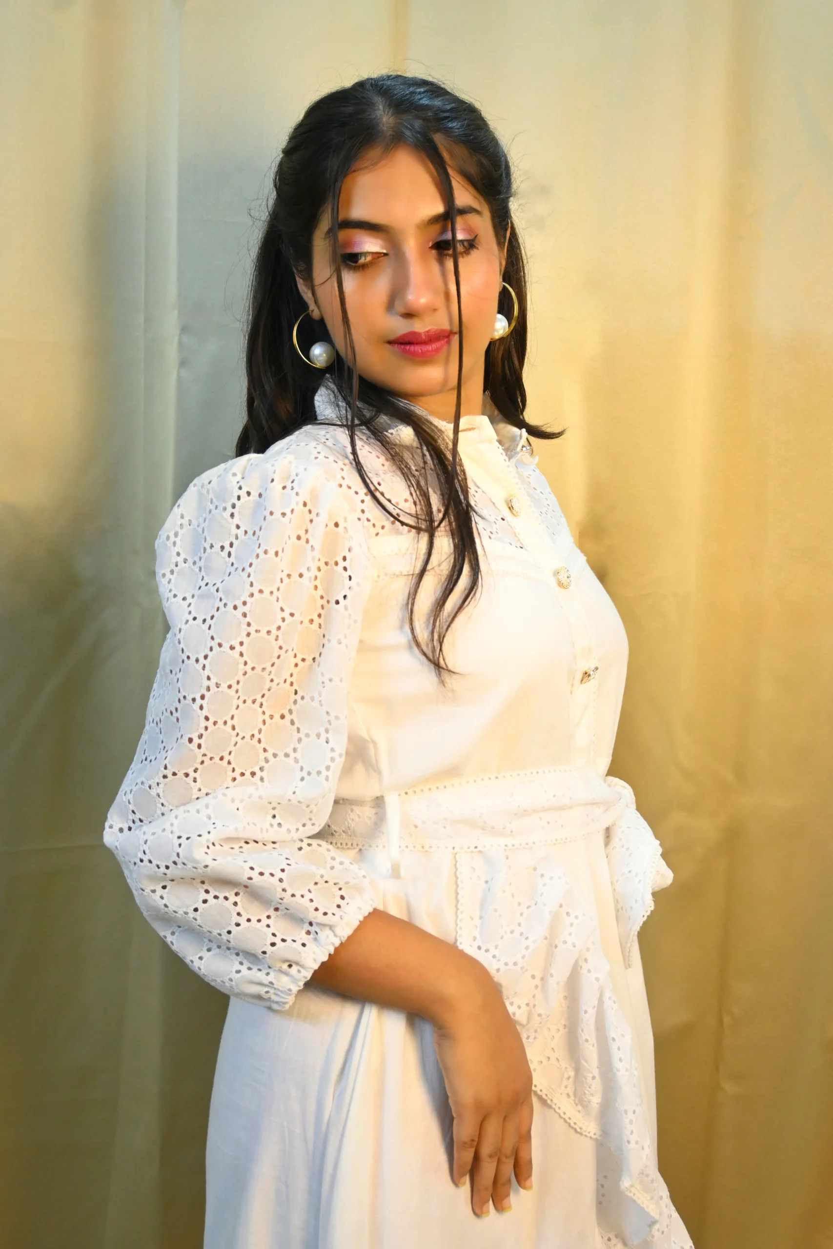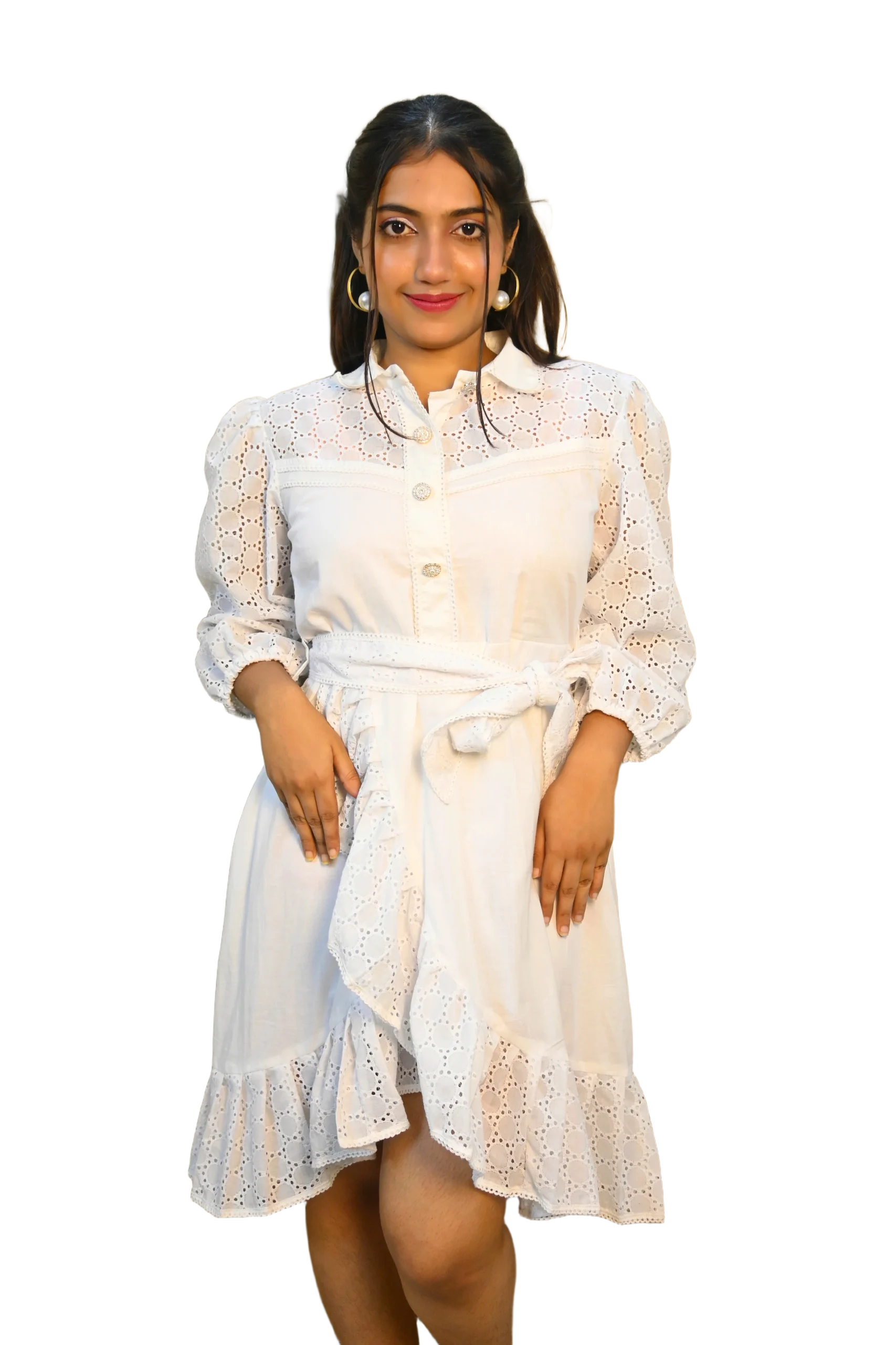 Float through your day in the ethereal beauty of our Whimsical Hakoba Wrap Dress. Crafted from delicate white hakoba eyelet fabric, this dress features a stylish collar, a button-front closure, and charming puffed sleeves. The adjustable tie-waist cinches for a perfect fit, leading to a unique, asymmetrical tiered ruffle skirt that adds a playful and romantic touch. This dress is an ideal choice for a sophisticated yet relaxed summer style.