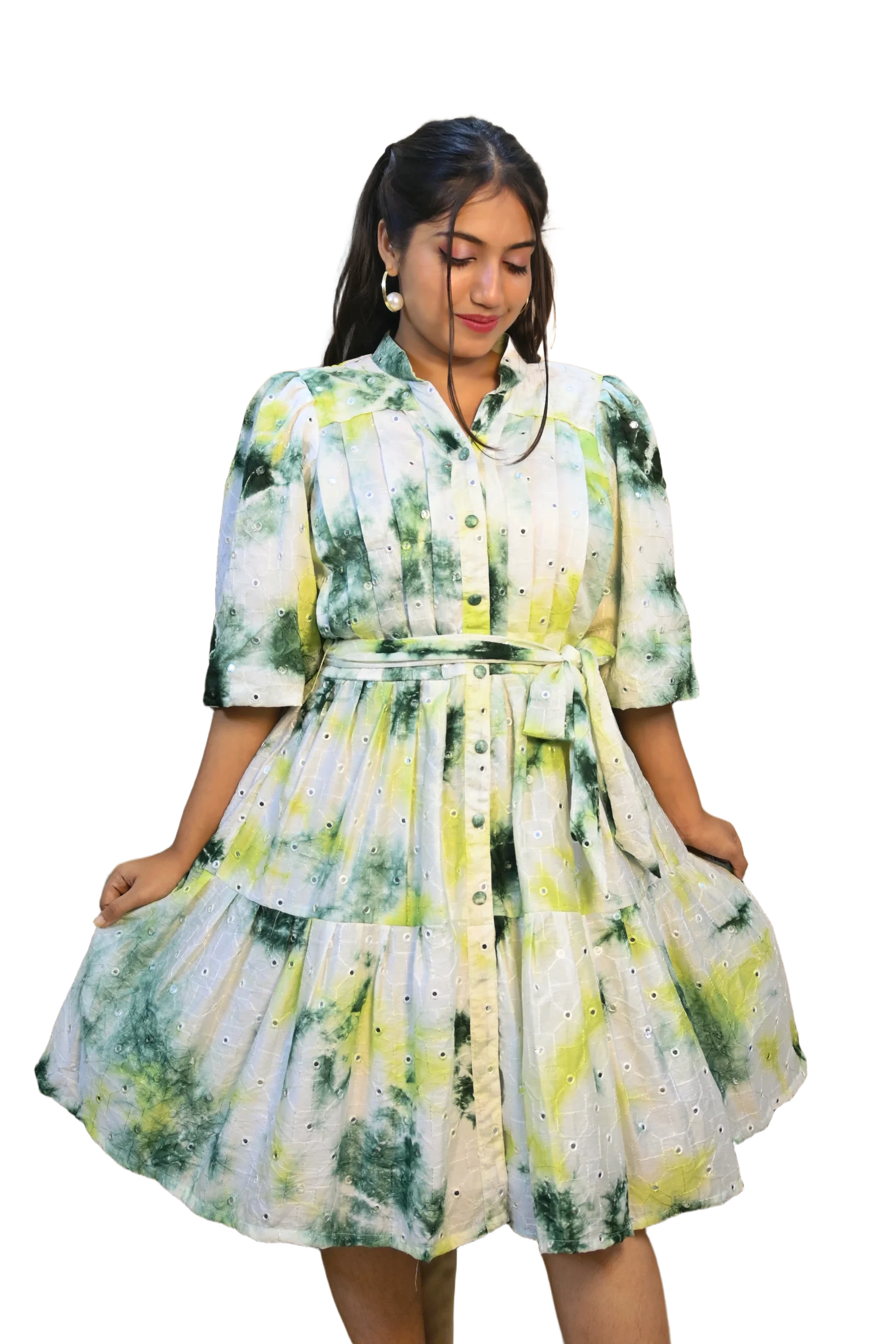 Immerse yourself in vibrant style with our Zen Garden Tie-Dye Dress. This playful and chic dress features an enchanting green and yellow tie-dye pattern on a crisp white fabric, creating a captivating watercolor effect. The classic button-down front, mandarin collar, and cinching tie-waist offer a tailored yet relaxed fit. Delicate pleating on the bodice and tiered ruffled skirt add texture and movement, while subtle eyelet details throughout elevate this fun piece. Perfect for weekend adventures, casual outings, or adding a pop of color to your everyday.
